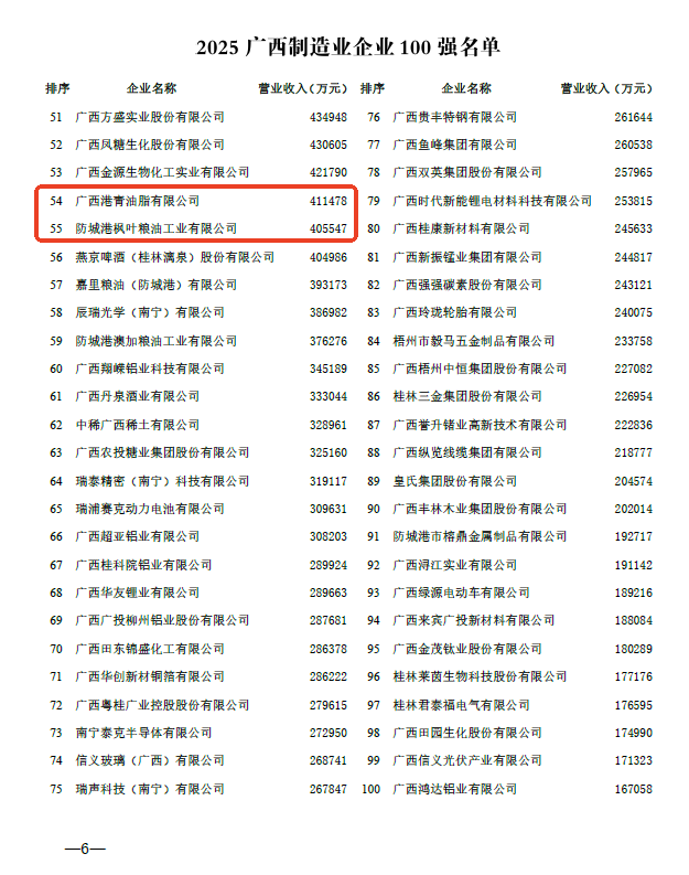 近日,广西企业与企业家联合会正式发布2025年度广西企业系列百强榜单。其中,港青油脂与枫叶粮油凭借稳健的发展实力,再度入选“广西制造业企业100强”榜单,至此已实现该荣誉的连续四年蝉联。