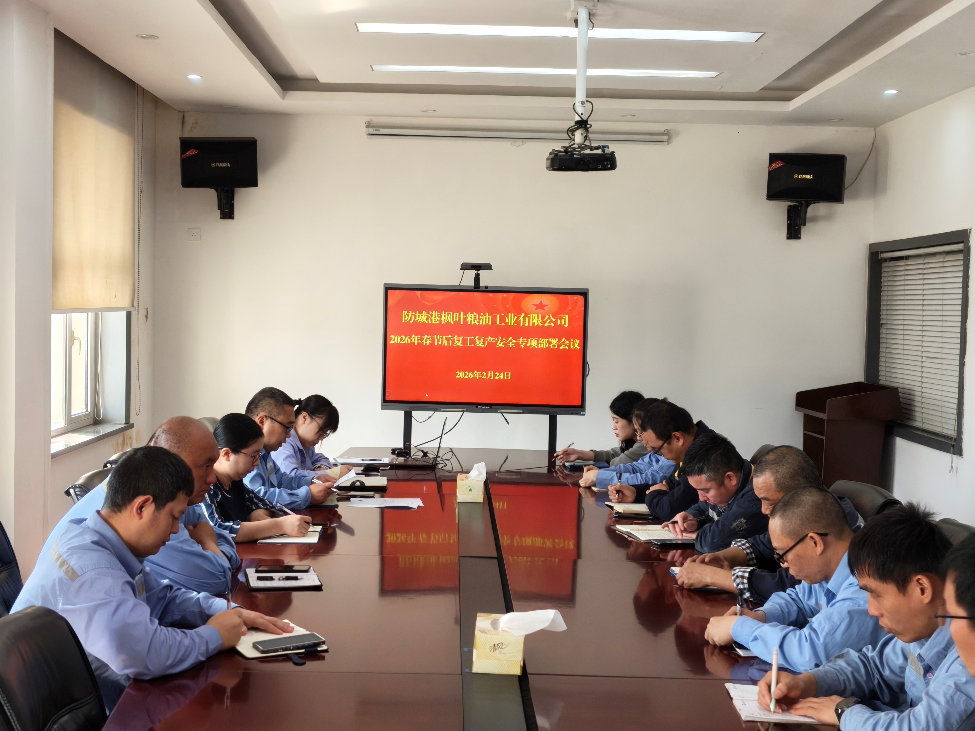 枫叶粮油于2月24日复工当天召开复工复产专题会议,部署重点任务、压实安全责任,确保管理人员、安全人员、班组长全部到岗到位,为复工复产提供坚强组织保障。