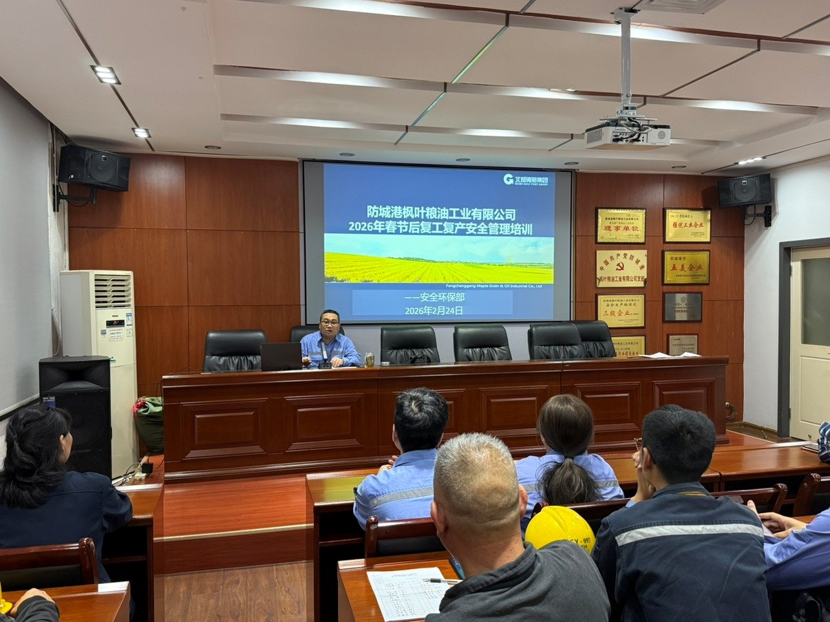 2月24—25日,枫叶粮油分两批次组织全体在岗员工及劳务人员开展复工复产安全培训,实现全覆盖。培训重点讲解安全法规、隐患排查、防范措施及应急要点,培训后组织理论考试,考核合格率100%,有效提升全员安全意识与操作能力。
