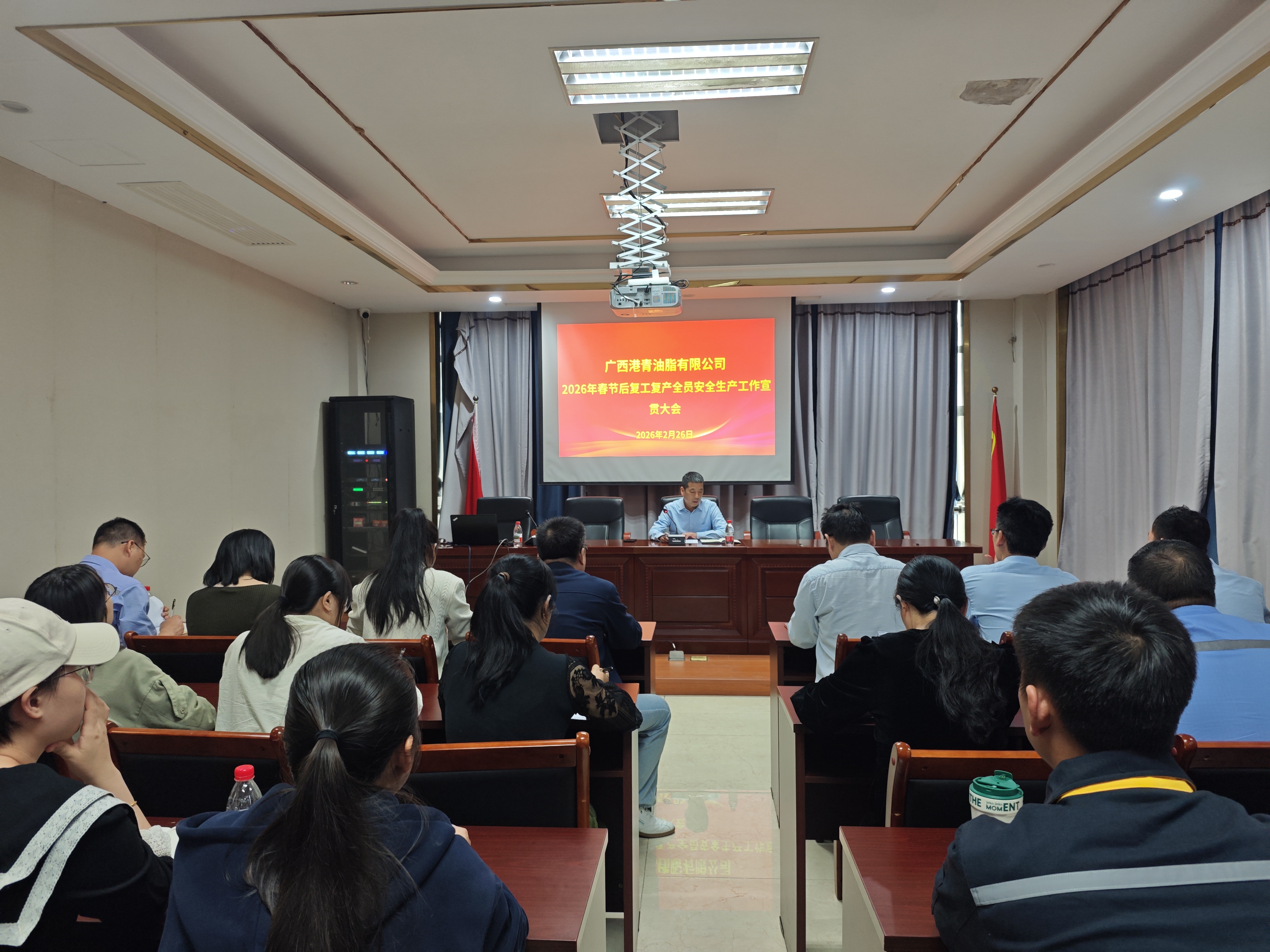 2月25-26日,港青油脂组织领导班子成员、各部门负责人及安全管理人员召开节后复工复产安全生产工作部署会议,传达学习上级关于节后复工复产安全生产工作指示精神,深入分析当前安全生产面临的形势和任务。组织公司全体员工参加节后复工复产全员安全生产会议,部署节后安全生产工作,号召员工迅速从“假期模式”切换到“工作模式”。